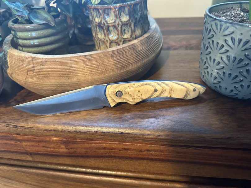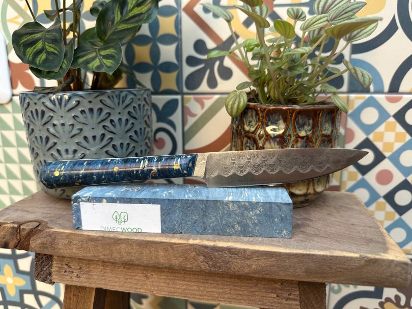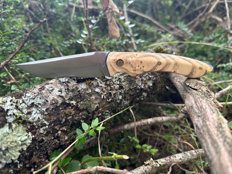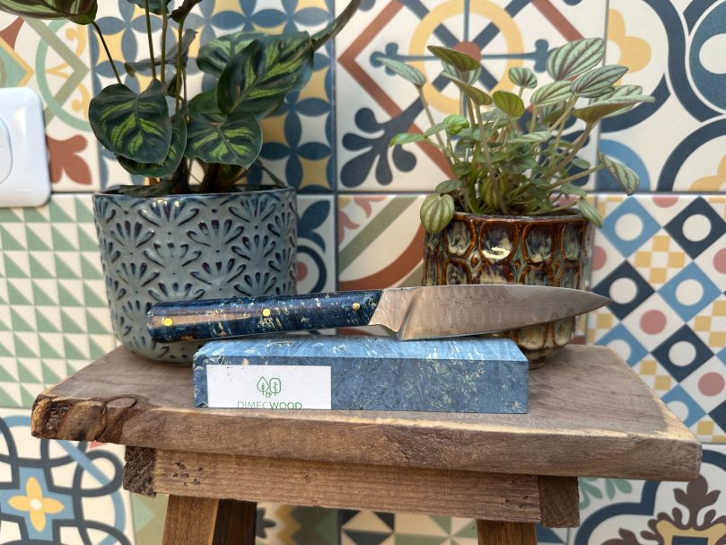 Lame acier XC75 finition satinée avec un manche en loupe de frêne naturelle (Intercalaire bleu, rivet mosaïque 6mm, rivet laiton 3mm)