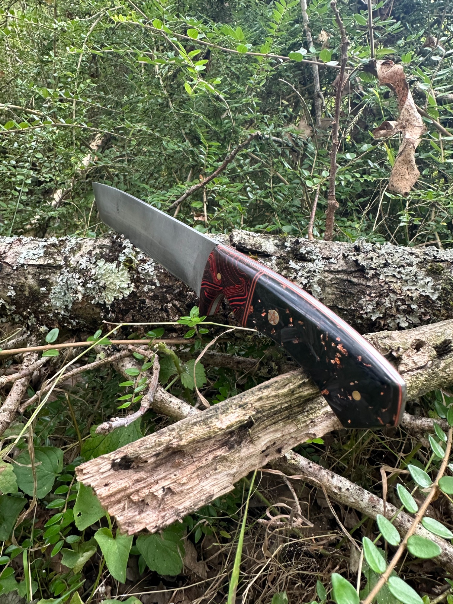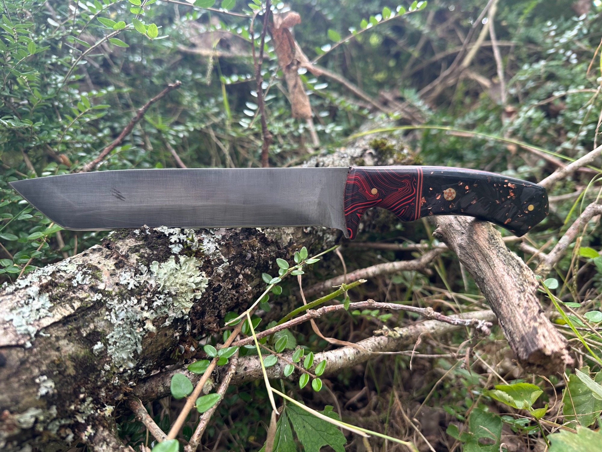 Lame acier XC75 finition grise. Manche en plaquettes carbone/G10 assemblées à la main par mes soins avec des intercalaires brique et noir.
