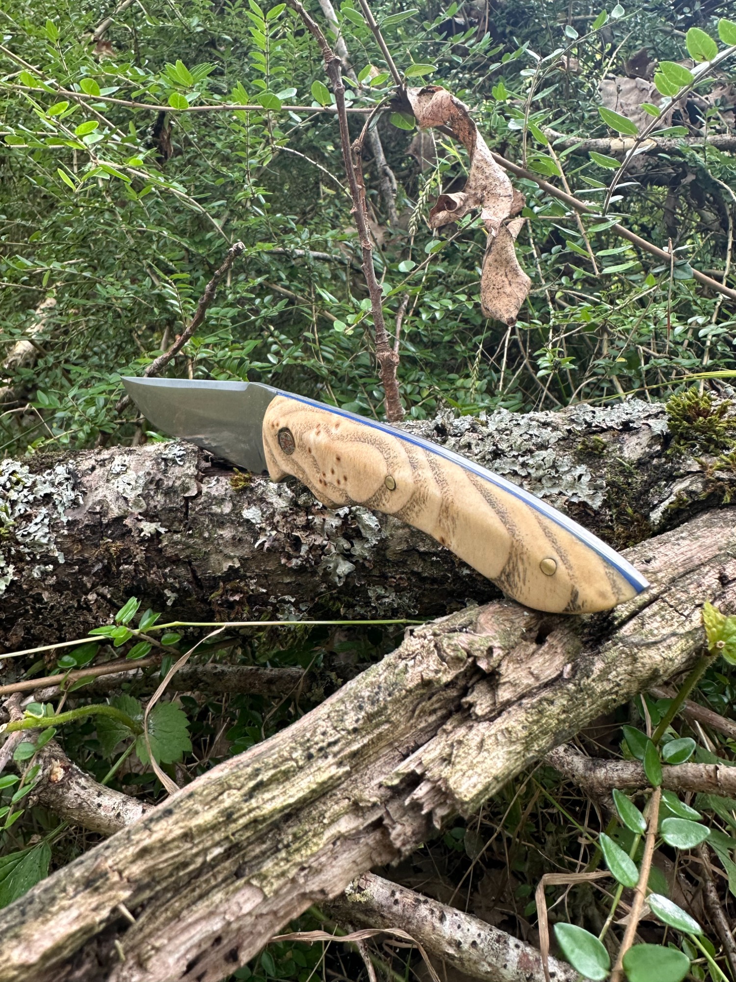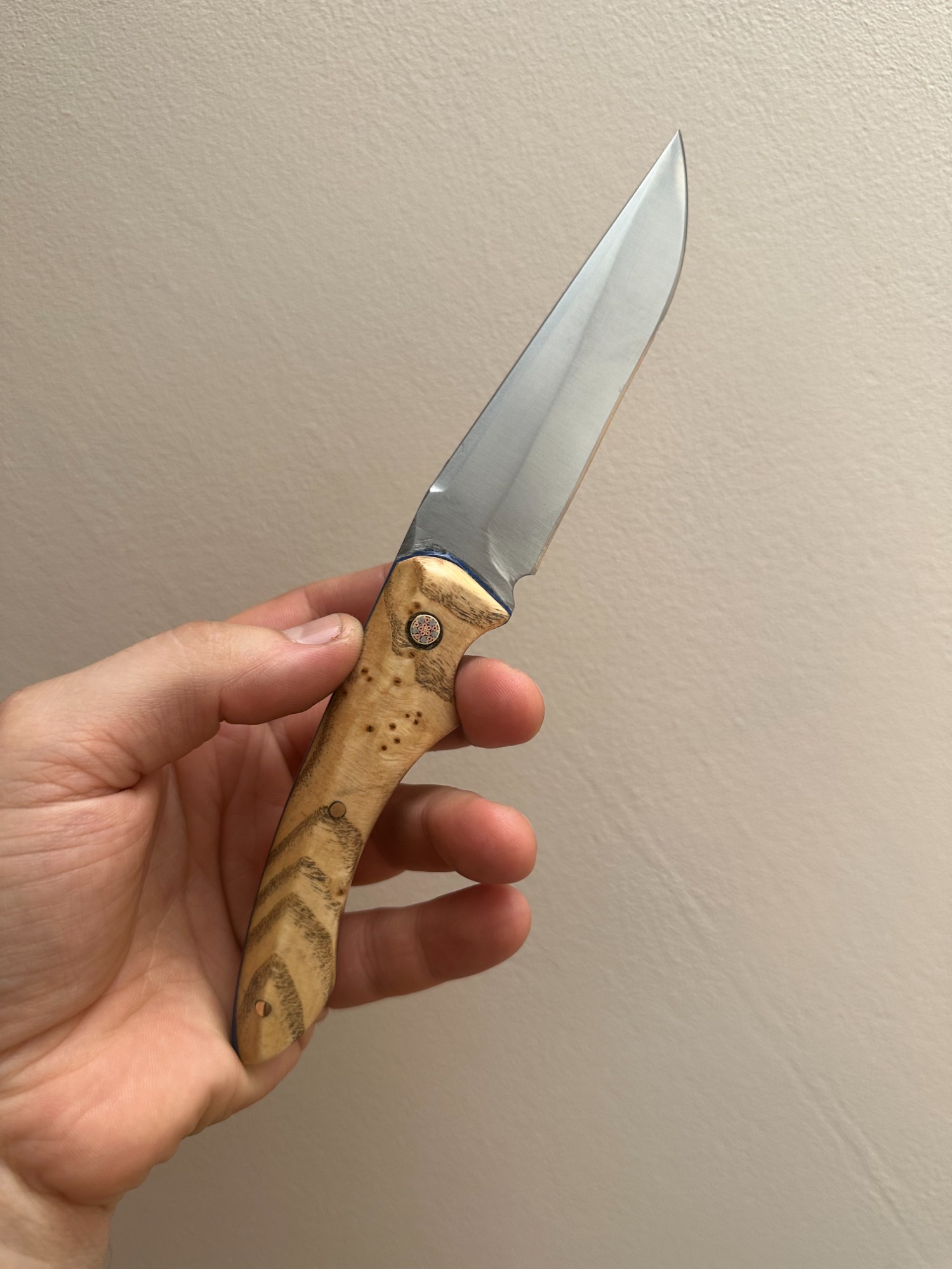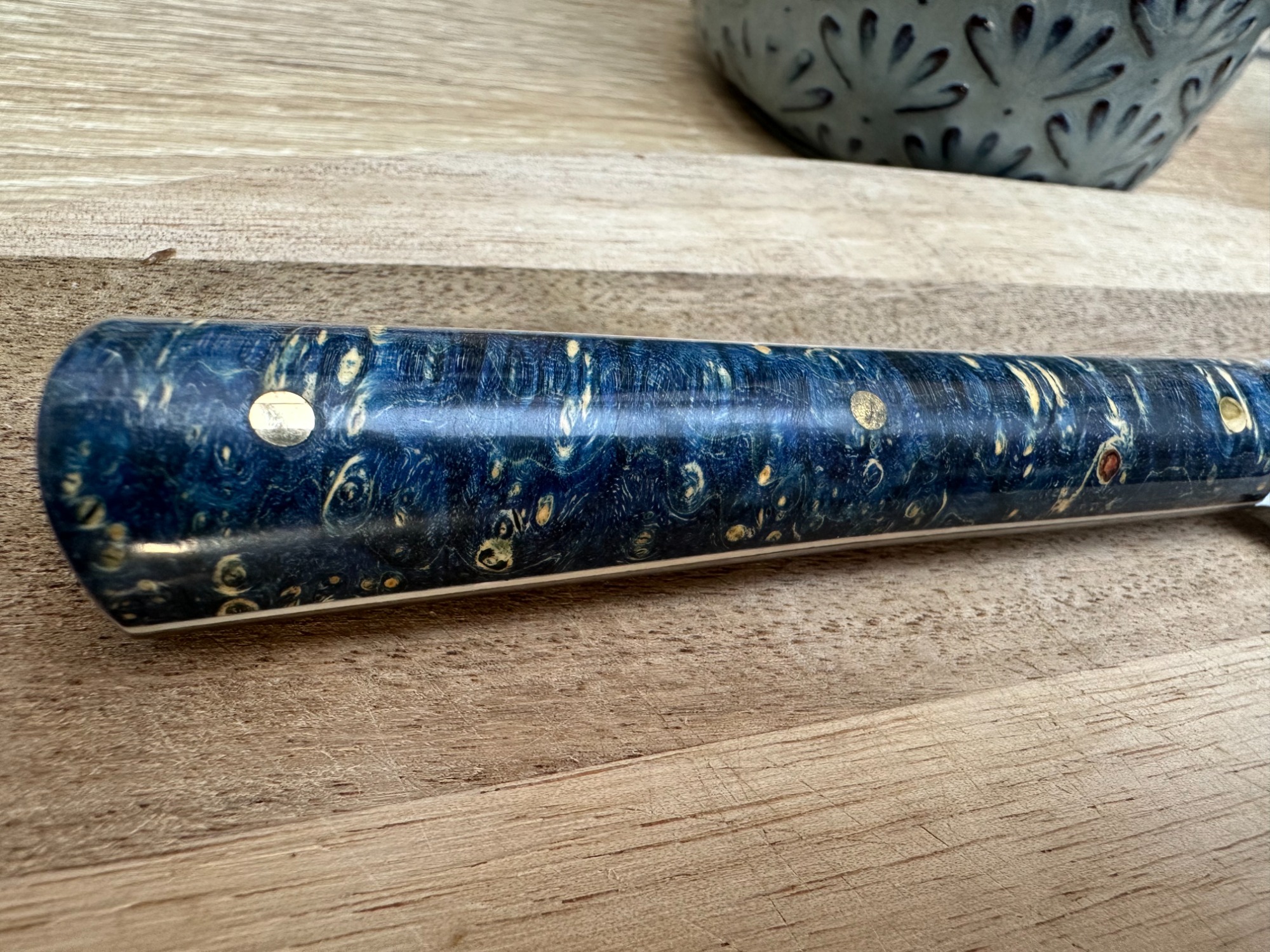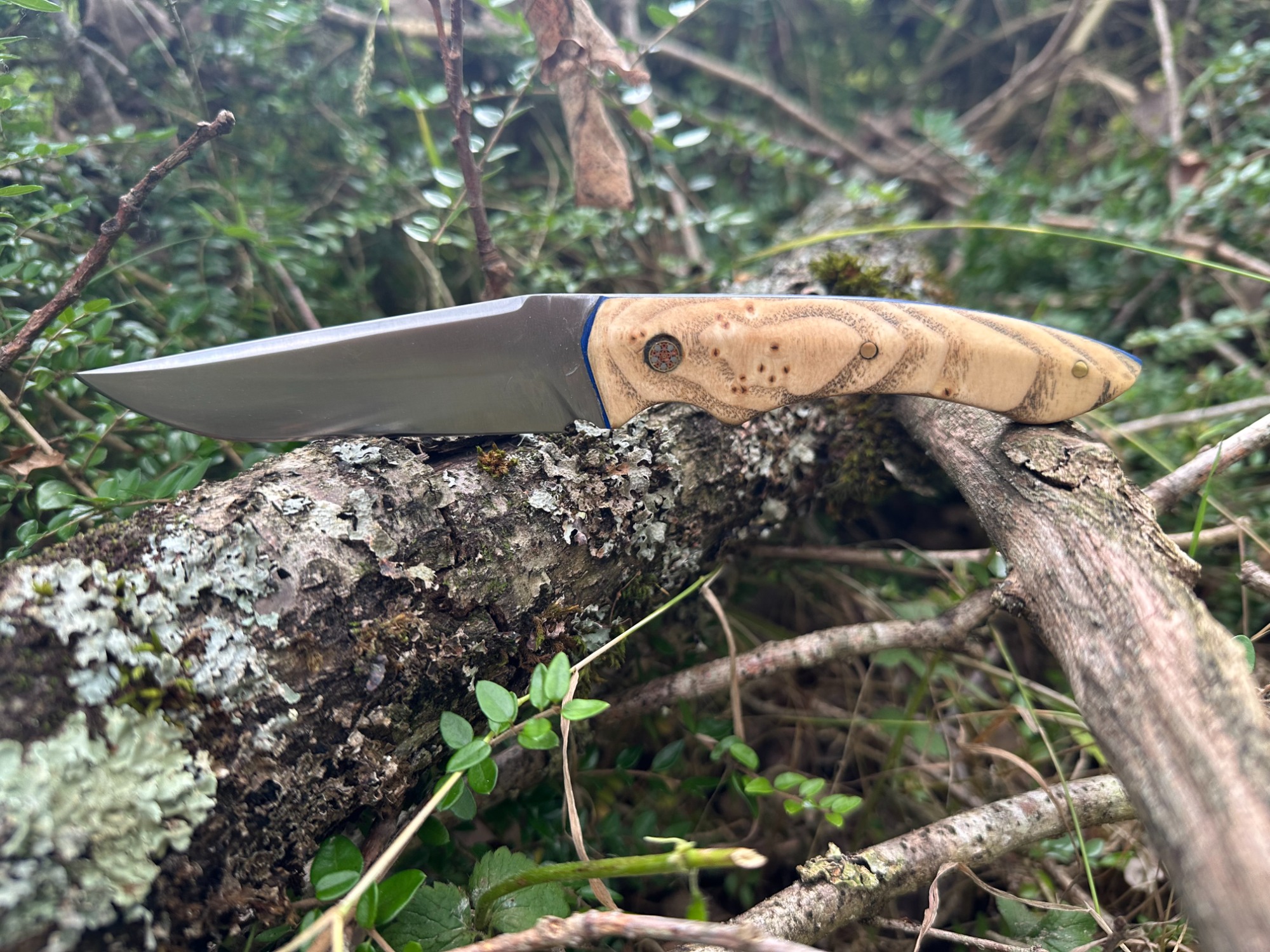 Lame acier XC75 finition satinée avec un manche en loupe de frêne naturelle (Intercalaire bleu, rivet mosaïque 6mm, rivet laiton 3mm)