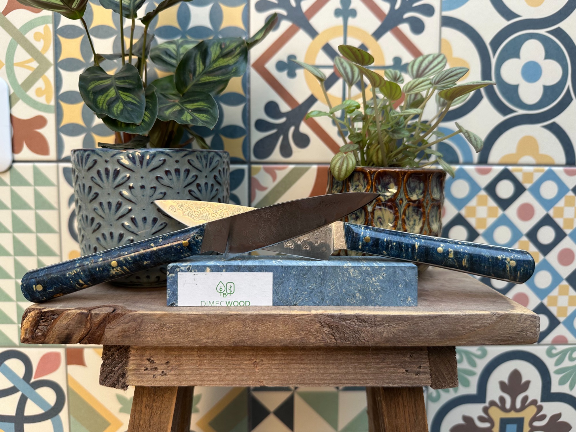 Deux couteaux d'office en damas de VG10. Finition satinée. Les manches sont en loupe de sureau stabilisé posés sur intercalaires blancs. Triple rivets laiton.
