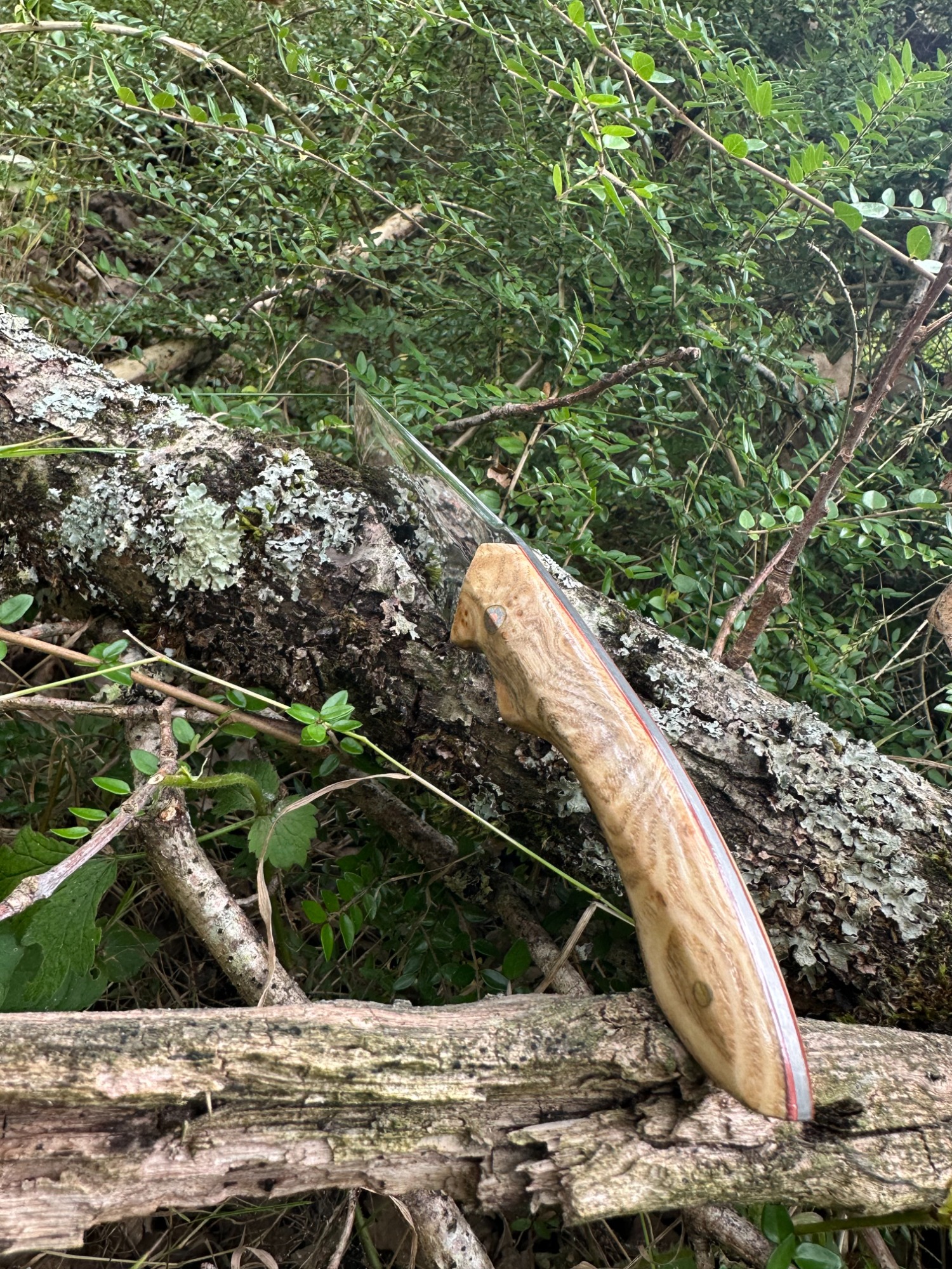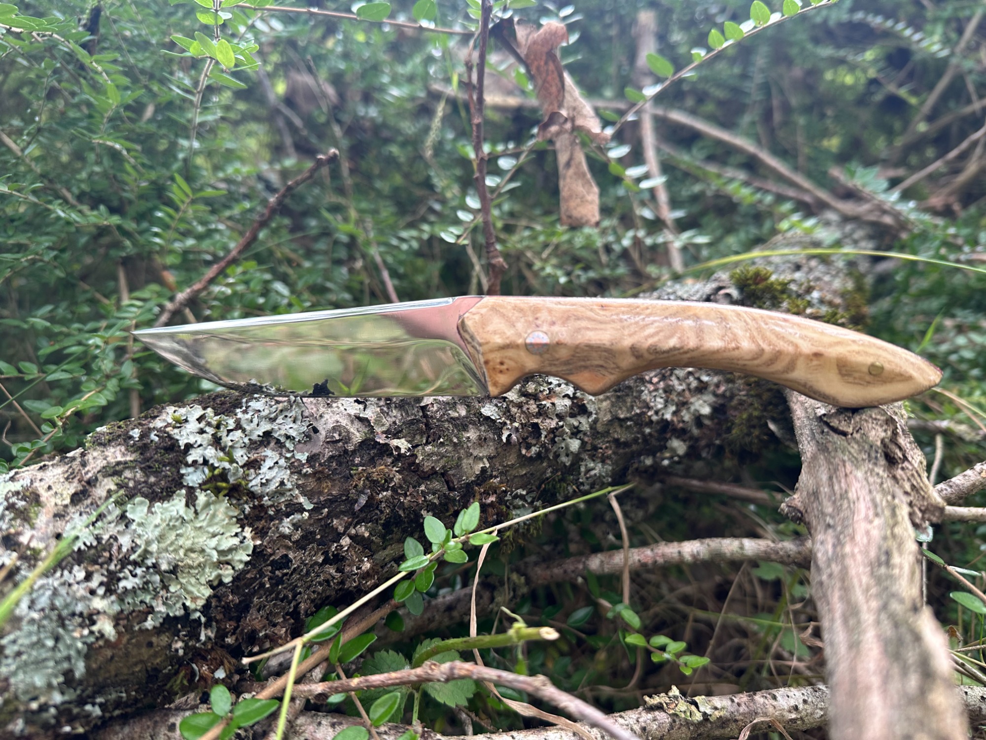 Lame acier XC75 finition miroir avec un manche en loupe de frêne naturelle (Intercalaire rouge, rivet mosaïque 6mm, rivet laiton 3mm)